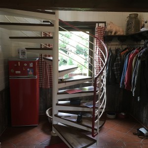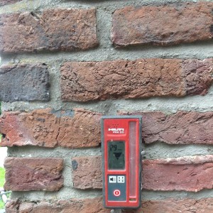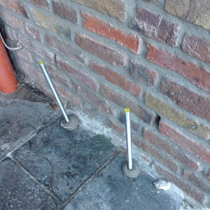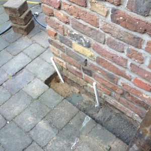 Setzungsursache: Das Treppenhaus neigt sich vom Haus weg. In den letzten 25 Jahren hat es sich  um 4,5 cm abgesenkt. Nicht ausreichende Tragfähigkeit des Baugrunds könnten zu der Setzung geführt haben, vor allem die Schicht 1.