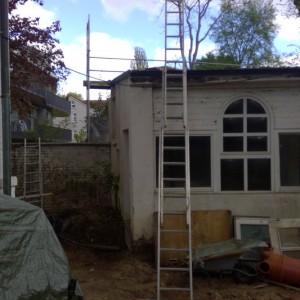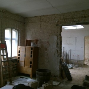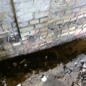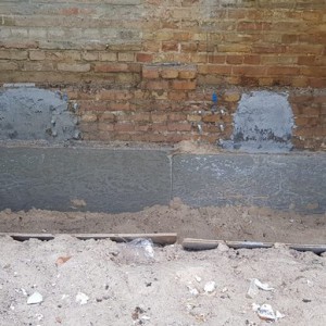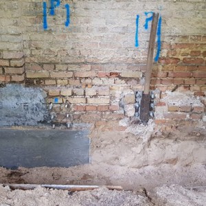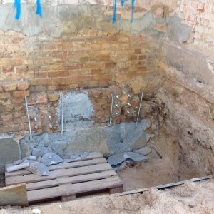 Setzungsursache: Unterfangung des bestehenden Mauerwerks für partiellen Ausbau des Kellers und Errichtung neuer Kellerwand. Mikropfähle werden sofort in den neuen Mauerwerk betoniert.