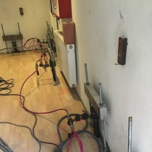 Eingriffsbeschreibung: Anhebung +3 cm des Bauwerks durch 11 MP-60 Mikropfähle aus gewallztem Stahl (CE-gekennzeichnetes Produkt gemäß europäischer Norm EN 1090-1:2009 - europäischer Patent 2918731) und Verfüllung des Hohlraums durch Injektionen KERASTABLE HDR