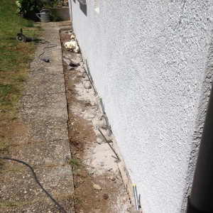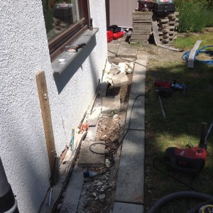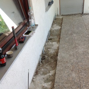 Setzungsursache: voraussichtlich Austrocknung des Untergrunds und Unterspuelung durch defekte Regenwasserleitungen.