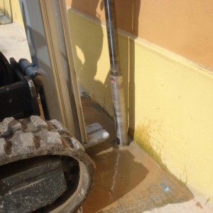 Zuerst werden Löcher mit ca. 6 cm Durchmesser senkrecht durch den Fundamentblock bzw. falls dieser nicht vorhanden ist leicht schräg durch die Fundamentmauer gebohrt. Die Bohrung wird unterbrochen, sobald das darunter befindliche Erdreich erlangt wird.